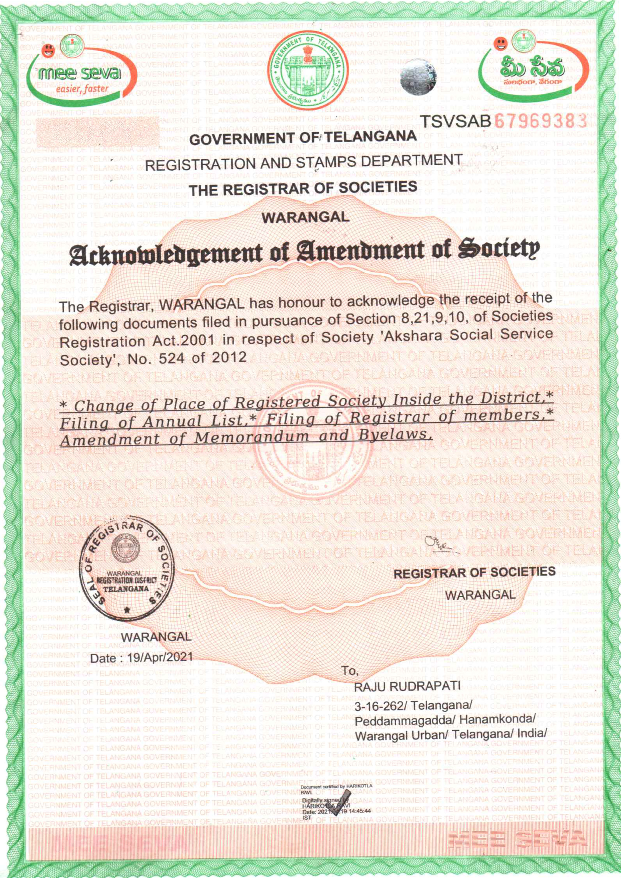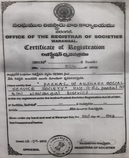 Akshara NGO is a charitable non-Profit organization, registered on 24/2010 under the government of Telangana. It is based in Warangal and estabkshed in 2012. Akshara NGO has been, functioning and providing for the past 10 years, basic needs to the poor people in order to eradicate the under poverty. Akshara NGO provides a wide range of welfare services which include.